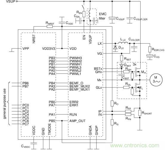 完善的內(nèi)部集成功能使得PCB板級的設(shè)計(jì)變得簡單,另外,其內(nèi)置的BEMF測量模塊,使得用戶在測量相電壓時(shí)無需使用外部分壓電阻,進(jìn)一步簡化板級的設(shè)計(jì)。