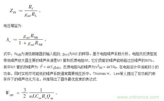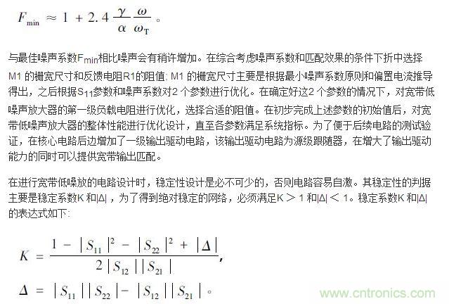 【導(dǎo)讀】本文給出了一種1 ~ 3 GHz 頻段的寬帶低噪聲放大器的設(shè)計(jì),電路采用電阻負(fù)反饋結(jié)構(gòu),采用SMIC 0.18 μm RF CMOS 工藝對(duì)寬帶低噪聲放大器進(jìn)行了優(yōu)化分析和仿真,結(jié)果表明在寬帶匹配、通道增益及噪聲系數(shù)方面都取得了較好的性能,對(duì)于寬帶低噪聲放大器的設(shè)計(jì)具有一定的參考價(jià)值。