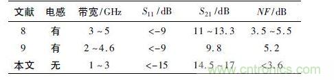 本文設(shè)計(jì)的寬帶低噪聲放大器與已經(jīng)發(fā)表文獻(xiàn)中的寬帶低噪聲放大器的性能比較如表1 所示,這些文獻(xiàn)均采用0. 18 μm 工藝進(jìn)行設(shè)計(jì),具有一定的比較意義。通過表1 可以看出,本設(shè)計(jì)中各項(xiàng)參數(shù)都達(dá)到了較好的性能指標(biāo),避免了傳統(tǒng)集成電路設(shè)計(jì)中需要采用電感的缺點(diǎn),而電感通常在電路設(shè)計(jì)中占用非常大的面積,本文設(shè)計(jì)的寬帶低噪聲放大器省略了傳統(tǒng)低噪聲放大器設(shè)計(jì)中的電感,這將在很大程度上減少芯片的面積; 更為重要的是該芯片依靠自身的MOS 管和比例電阻實(shí)現(xiàn)了內(nèi)匹配,避免了大批量應(yīng)用時(shí)由于芯片內(nèi)部參數(shù)受工藝參數(shù)影響而造成的外圍匹配電路的更改,簡(jiǎn)化了芯片的應(yīng)用,在實(shí)際的工程應(yīng)用中具有重要的意義。