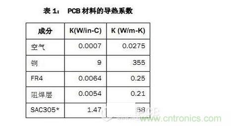 該P(yáng)CB主要由FR4電路板材料和銅組成,另有少量焊料、鎳和金。表1列出了主要材料的導(dǎo)熱系數(shù)。