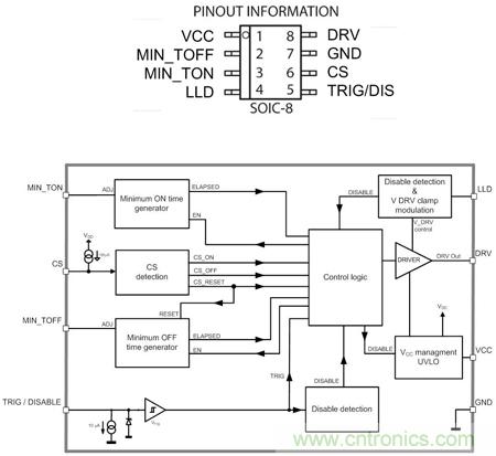 NCP4305可采用SOIC-8、DFN8和WDFN8三種封裝。MIN_TOFF 和MIN_TON引腳通過連接電阻到地,調(diào)節(jié)最小關(guān)斷和最小導(dǎo)通時(shí)間。LLD引腳用于在輕載時(shí)調(diào)節(jié)驅(qū)動(dòng)器鉗位電平,或關(guān)斷驅(qū)動(dòng)器。DRV引腳是同步整流MOSFET的驅(qū)動(dòng)器輸出。CS(電流采樣檢測)引腳用于檢測電流是否流過同步整流MOSFET。TRIG/DIS引腳提供超快關(guān)斷輸入,用作在CCM應(yīng)用中關(guān)斷同步整流MOSFET以提升能效,當(dāng)上拉超過100 us時(shí)激活禁用模式。