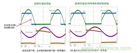 在CCM應(yīng)用中,當(dāng)初級端MOS管導(dǎo)通時(shí),通過隔離驅(qū)動(dòng)器強(qiáng)制使次級端MOS管關(guān)斷;當(dāng)初級端MOS管關(guān)斷, TRIG腳功能使次級端MOS管導(dǎo)通。這種交替導(dǎo)通特性大大提高系統(tǒng)能效。如圖5所示,無觸發(fā)功能的初級端和次級端驅(qū)動(dòng)信號交疊的時(shí)間為40 ns,遠(yuǎn)大于帶觸發(fā)功能的12 ns,也就是說,觸發(fā)功能將縮短延遲時(shí)間,從而降低損耗。