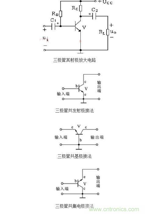 為了更進(jìn)一步的說(shuō)明這種三極管開關(guān)電路的設(shè)計(jì)原理,在這里我們以NPN三極管的共發(fā)射極放大電路為例,來(lái)具體的說(shuō)明一下。下圖中所提供的三種連接方式是三極管放大電路最常見的,除了共發(fā)射極聯(lián)接方式外,還有共集電極和共基極聯(lián)接方式。