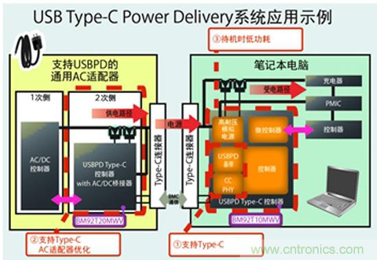 ROHM不僅擁有滿足以往的USB Type-A/B標(biāo)準(zhǔn)的USB PD控制IC(BD92S系列)產(chǎn)品,還新開(kāi)發(fā)出滿足最新的USB Type-C標(biāo)準(zhǔn)Rev1.1和USB PD標(biāo)準(zhǔn)Rev2.0的USB PD控制IC(BM92T系列)。BM92T系列在以往僅可 供電10W左右的滿足Type-C標(biāo)準(zhǔn)的設(shè)備之間,可實(shí)現(xiàn)高達(dá)100W(20V / 5A)的供受電。由此,電腦和電視等需要 大功率的設(shè)備,也可通過(guò)USB端子供電來(lái)帶動(dòng)(圖4)。