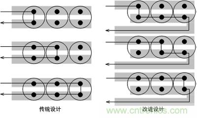 輸出濾波電容放置及走線對紋波噪聲至關(guān)重要,如圖1所示,傳統(tǒng)設(shè)計中由于到達(dá)每個電容的阻抗不一樣,所以高頻電流在三個電容中分配不均勻,改進(jìn)設(shè)計中可以看出每個回路長度相當(dāng)即高頻電流會均勻分配到每個電容中。