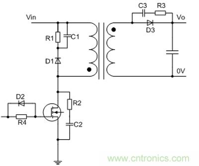 二極管在高速導(dǎo)通和關(guān)斷時,反向恢復(fù)期間,二極管的寄生電感和電容會產(chǎn)生高頻振蕩,為了抑制高頻振蕩可在二極管兩端加RC緩沖電路如圖2所示,電阻R3一般在1Ω~100Ω,電容C3一般在100pF~1nF,如果電源工作頻率較低,效率滿足要求的話,二極管D3可以選擇反向恢復(fù)時間較慢的二極管。