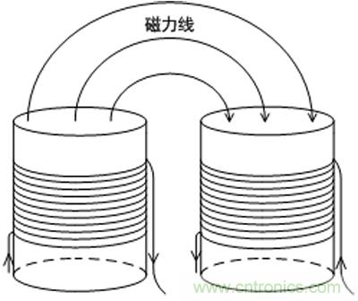LC對噪聲和紋波抑制效果比較明顯,根據(jù)紋波頻率選擇合適電感電容值,但由于柱形電感價格低體積小的優(yōu)點(diǎn),所以一般LC中電感大都會選擇柱形電感,然而柱形電感是開放式磁結(jié)構(gòu),對周圍會產(chǎn)生較嚴(yán)重磁干擾,我們可以采用兩個電感并排放置,且電流流入方向相反,即有助于引導(dǎo)磁通從一個磁柱到另一個磁柱,從而可以降低電磁干擾,如圖3所示。