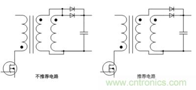 當(dāng)電源輸出電流較大時,通常我們會采用兩個繞組并聯(lián)的方式進(jìn)行使用,這兩個繞組通常分置于原邊繞組內(nèi)外,所以直流阻抗會略有差異,從而有可能產(chǎn)生內(nèi)部環(huán)流,電壓波形也會出現(xiàn)嚴(yán)重的振鈴,并且電磁干擾會變的更加嚴(yán)重,以及有可能會出現(xiàn)意外的大量發(fā)熱,如果輸出繞組一定需要并聯(lián)使用,最好采用如圖4的推薦電路,圖4推薦電路中二極管可以消除兩個不同繞組的不均勻?qū)е碌呢?fù)面影響。