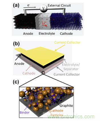 鋰離子電池的結(jié)構(gòu)示意圖,其中Li+(鋰離子)在內(nèi)電路中,通過電解質(zhì)傳導(dǎo)