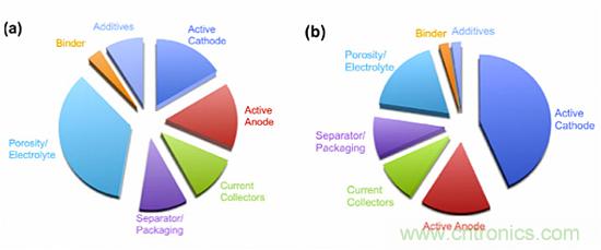 現(xiàn)在鋰離子電池各組分的(a)體積占比和(b)質(zhì)量占比