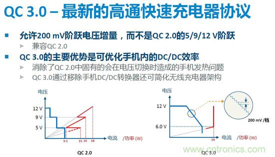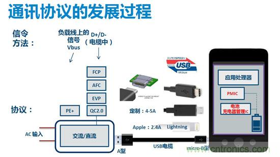 從事電源設(shè)計(jì)開發(fā)和技術(shù)支持工作超過(guò)24年的Jason分析道,從線型降壓電源開始,電源開發(fā)在摸索中前進(jìn),體積越做越小,充電方式也迎來(lái)了新的變革,現(xiàn)在的趨勢(shì)是快速充電。以前的充電器只提供一個(gè)固定的輸出電壓(5V),電源提供的輸出功率取決于輸出電流的大小,輸出電流越大則提供給電池端的功率更大,從而提高充電效率減小充電時(shí)間。但電流不能無(wú)限制的增加,因在輸出電纜的功耗隨電流的增大會(huì)相應(yīng)的增加。因而快速充電應(yīng)用應(yīng)運(yùn)而生。其實(shí)現(xiàn)方法是手機(jī)跟充電器進(jìn)行雙向通訊,電源會(huì)根據(jù)負(fù)載端發(fā)出的指令做出反應(yīng),改變其輸出電壓和電流,實(shí)現(xiàn)減小功率損耗、增大充電功率、減小充電時(shí)間的目的,從而實(shí)現(xiàn)快速充電。