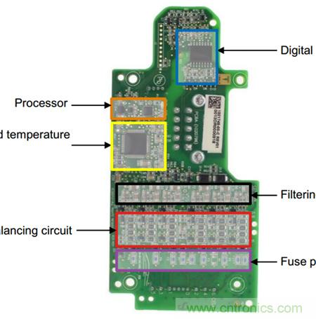 因?yàn)閮煞N均衡功能各有利弊,本來(lái)主動(dòng)均衡功能是可以替代被動(dòng)均衡功能的,但因?yàn)榻Y(jié)構(gòu)復(fù)雜成本高,而且結(jié)構(gòu)復(fù)雜之后故障率也會(huì)高而與被動(dòng)均衡處于膠著狀態(tài),業(yè)內(nèi)人士常為了哪種均衡更好爭(zhēng)論不休。特斯拉的BMS均衡功能(被動(dòng)均衡,見(jiàn)下圖中Cellbalancingcircuit中所指均為放電電阻)經(jīng)常被示范以證明被動(dòng)均衡強(qiáng)于主動(dòng)均衡。其實(shí)這反而證明了任何技術(shù)選擇都要和整體條件適用的道理。