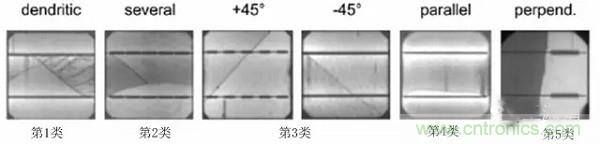 2011年,德國(guó)ISFH公布了他們的研究結(jié)果:根據(jù)電池片隱裂的形狀,可分為5類:樹狀裂紋、綜合型裂紋、斜裂紋、平行于主柵線、垂直于柵線和貫穿整個(gè)電池片的裂紋。