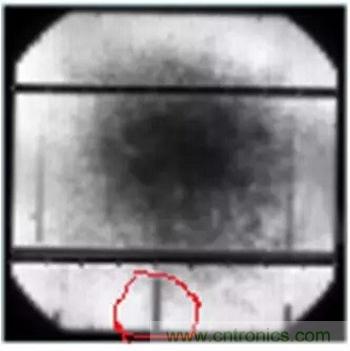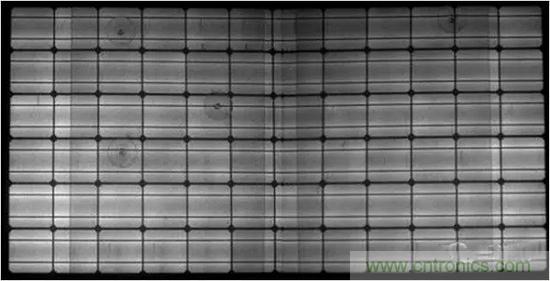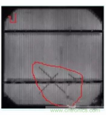 給晶硅組件施加電壓后,所激發(fā)出的電子和空穴復(fù)合的數(shù)量越多,其發(fā)射出的光子也就越多,所測(cè)得的EL圖像也就越亮;如果有的區(qū)域EL圖像比較暗,說(shuō)明該處產(chǎn)生的電子和空穴數(shù)量較少(例如圖3中電池中部),代表該處存在缺陷(復(fù)合中心);如果有的區(qū)域完全是暗的,代表該處沒(méi)有發(fā)生電子和空穴的復(fù)合(圖3和圖4中紅線所標(biāo)處),也或者是所發(fā)光被其它障礙所遮擋(圖3和圖4主柵線處),無(wú)法檢測(cè)到信號(hào)。
