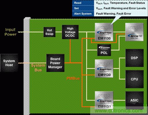 (2)另一常見的系統(tǒng)電源要求是能夠進行遠程監(jiān)視,對電源各參數(shù)進行實時監(jiān)視、故障報警和相應調(diào)節(jié)。而最簡單、最便宜、最緊湊的方式是使用集成了遠程監(jiān)視功能和相應的通信總線的電源調(diào)節(jié)器。通過智能電壓ID(SmartVID)特性,Altera的Arria 10 FPGA和SoC通過PMBus接口,確定與Enpirion電壓調(diào)節(jié)器系統(tǒng)之間所需的VCC電壓和通信,將內(nèi)核電壓軌盡可能動態(tài)調(diào)整到最小,而不會犧牲系統(tǒng)性能。同時,支持PMBus的Enpirion的ED8101P0xQI單相數(shù)字控制器,與ET4040QI大電流電源配對使用,可實現(xiàn)對FPGA的多種遠程監(jiān)視和低功耗特性。