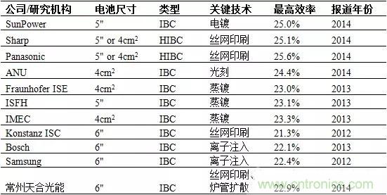 在IBC結(jié)構(gòu)上,SunPower公司的研發(fā)遙遙領(lǐng)先,其它研究成果如德國(guó)FraunhoferISE的23%,ISFH的23.1%,IMEC的23.3%等等。最近,日本的研發(fā)人員將IBC與異質(zhì)結(jié)(HJ)技術(shù)相結(jié)合,在2014年將晶體硅電池的效率突破到25%以上。其中日本Sharp和Panasonic公司將IBC與HJ技術(shù)結(jié)合在一起,研發(fā)的晶硅多結(jié)電池效率分別達(dá)到25.1%和25.6%。