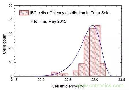 同年,由常州天合光能光伏科學(xué)與技術(shù)國(guó)家重點(diǎn)實(shí)驗(yàn)室獨(dú)立研發(fā)的6英寸大面積IBC電池效率已達(dá)22.9%,成為了6英寸IBC電池的最高轉(zhuǎn)換效率。同時(shí),天合光能依托國(guó)家863項(xiàng)目建成中試生產(chǎn)線,進(jìn)入2015年后,天合光能科研人員采用最新開(kāi)發(fā)的工藝,在中試生產(chǎn)線做出了平均22.8%,最高23.15%(內(nèi)部測(cè)試)的結(jié)果,大部分電池效率在22%以上,如圖1所示,達(dá)到了目前工業(yè)級(jí)6英寸晶體硅電池效率的最高水平(SunPower電池均為5英寸)。