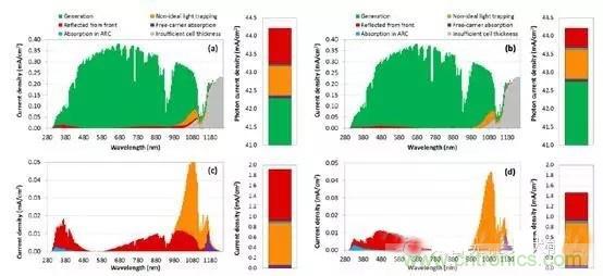 對(duì)于晶體硅太陽(yáng)電池,前表面的光學(xué)特性和復(fù)合至關(guān)重要。對(duì)于IBC高效電池而言,更好的光學(xué)損失分析和光學(xué)減反設(shè)計(jì)顯得尤其重要。McIntosh等人采用橢偏儀、量子相應(yīng)測(cè)試與數(shù)值模擬相結(jié)合的方法,定量的確定了IBC電池的光學(xué)損失,包括前表面發(fā)射、減反膜寄生吸收、長(zhǎng)波段不完美光陷阱、自由載流子吸收的影響等,如圖3所示。
