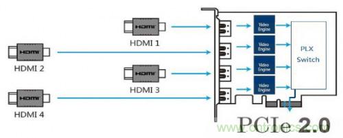 針對圖三中主流的四通道架構(gòu),PLX Switch可以選擇PEX8608,客戶如果有更多通道需求,如八通道,建議選擇PEX8618,但具體要根據(jù)客戶數(shù)據(jù)量來決定,系統(tǒng)架構(gòu)完全一致,對項(xiàng)目來說,只需要更換PCIE Switch就可以滿足不同應(yīng)用需求,軟件方面無需改動(dòng),加速上市時(shí)間,搶占市場。