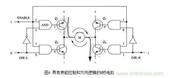 采用以上方法,電機(jī)的運(yùn)轉(zhuǎn)就只需要用三個(gè)信號(hào)控制:兩個(gè)方向信號(hào)和一個(gè)使能信號(hào)。如果DIR-L信號(hào)為0,DIR-R信號(hào)為1,并且使能信號(hào)是1,那么三極管Q1和Q4導(dǎo)通,電流從左至右流經(jīng)電機(jī)(如圖5所示);如果DIR-L信號(hào)變?yōu)?,而DIR-R信號(hào)變?yōu)?,那么Q2和Q3將導(dǎo)通,電流則反向流過電機(jī)。