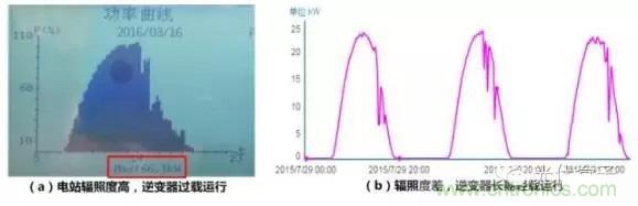 湖北某電站采用30kW組串式逆變器,由于所選逆變器的直流輸入能力不足,單臺逆變器直流側(cè)最大只能配置30kWp的組件,即容配比1:1。當(dāng)光照資源相對較差,即使在全年輻照最高時(shí),逆變器實(shí)際輸出功率也僅為25kW,如圖1(b)所示。逆變器及