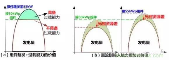 如正面案例所述,當(dāng)輻照度或溫度等環(huán)境條件變化時(shí),組件輸出功率會超過規(guī)格書中標(biāo)定的最大功率,即“組件超發(fā)”,此種情況通常發(fā)生在部分光照資源較好的部分Ⅰ類資源區(qū),這就要求逆變器需具備將組件能量全部轉(zhuǎn)化的能力,即對逆變器“吐”的能力要求較高。否則將會出現(xiàn)棄光的現(xiàn)象,降低發(fā)電量,影響用戶收益,如圖2(a)所示。
