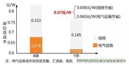 上述分析僅僅是考慮了光照資源,但在實(shí)際光伏系統(tǒng)中,由于灰塵遮擋,組件輸出至少降低2-3%,再考慮到組件衰減、電纜損耗等因素,實(shí)際傳輸?shù)侥孀兤鬏斎攵说闹绷鞴β视謺p少5-10%左右。此外,根據(jù)1.6MW典型系統(tǒng)設(shè)計(jì)方案成本計(jì)算表明,50kW組串式逆變器直流側(cè)接9串方案比8串方案,逆變器數(shù)量減少了12%以上,可節(jié)省系統(tǒng)初投資0.07元/W,100MW可節(jié)約初始投資700萬,這便是逆變器較高的“吞”能力帶來的好處,如圖3所示。