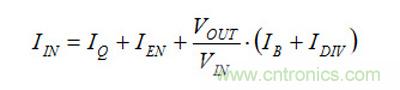 由于這個(gè)方程式?jīng)]有將轉(zhuǎn)換器中的損耗算在內(nèi),所以它給出的是一個(gè)最佳情況下的估算值。第一個(gè)被稱(chēng)為IQ的數(shù)據(jù)是我在上一部分中談到的非開(kāi)關(guān)式靜態(tài)電流。下一個(gè)數(shù)據(jù)項(xiàng),IEN 是進(jìn)入穩(wěn)壓器使能輸入的電流。很多轉(zhuǎn)換器需要一定大小的偏置電流流入使能輸入。如果使能引腳被連接至輸入電源,以接通穩(wěn)壓器的話(huà),那么你必須將這個(gè)電流考慮在內(nèi);否則的話(huà),這個(gè)值為零。數(shù)據(jù)項(xiàng)IDIV 是反饋分頻器內(nèi)的電流,使用方程式2,可以很容易地計(jì)算出這個(gè)值: