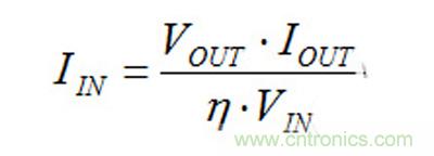 你還可以使用效率曲線來(lái)計(jì)算DC/DC轉(zhuǎn)換器的輸入電流,不過(guò)這個(gè)電流值不是無(wú)負(fù)載情況下的電流值。理論上,無(wú)負(fù)載時(shí)的效率為零,所以,你必須使用我在本文中介紹的方法估算出無(wú)負(fù)載電源電流。在任何其它的負(fù)載條件下,你可以使用數(shù)據(jù)表中的效率曲線,連同方程式3來(lái)完成計(jì)算: