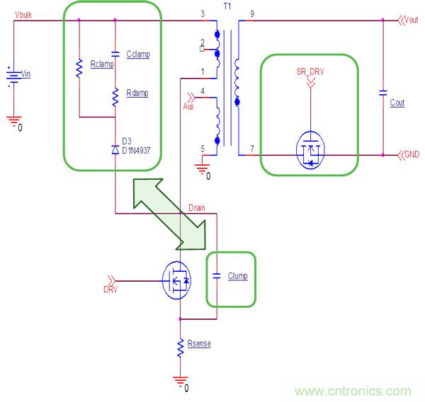 準(zhǔn)諧振模式允許使用相對(duì)大的緩沖電容Clump,額外增加的Clump (10-22pF)可以減少M(fèi)OS管關(guān)斷損耗,減少電磁干擾(EMI)。準(zhǔn)諧振反激有利于次極端加SR,可降低整流二極管導(dǎo)通損耗,減少次極端整流管尖峰電壓,降低其耐壓要求。
