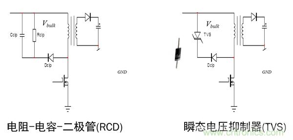 尖峰吸收電路主要用于鉗制MOS管Vds電壓,防止其過(guò)壓擊穿。電阻-電容-二極管(RCD)吸收和瞬態(tài)電壓抑制器(TVS)吸收是兩種常用的電路,其中RCD最為常用,可靠性較高。