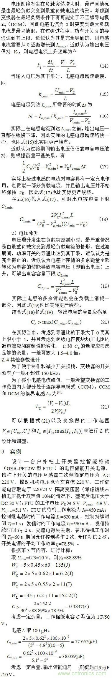 根據(jù)能量平衡關(guān)系,分析了負(fù)載突然增大和負(fù)載突然減輕情況下的最嚴(yán)重電壓凹陷和電壓驟升,并得出輸出濾波電容容量的設(shè)計(jì)考慮。以一個具體的電容儲能FTU電源為例,詳細(xì)說明了電路參數(shù)的設(shè)計(jì)方法,并進(jìn)行了實(shí)驗(yàn)研究。實(shí)驗(yàn)結(jié)果表明所設(shè)計(jì)的電容儲能備用電源能夠滿足在失去正常供電電源后自動化終端待機(jī)、操作和通信的需要,并且所進(jìn)行的理論分析與實(shí)際情況相符。