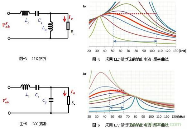 圖-4和圖-6分別是LLC與LCC的輸出電流隨頻率的變化曲線,不同曲線代表不同負(fù)載電阻條件。