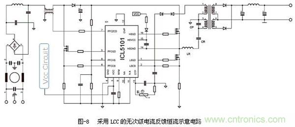 圖-8是省略次級(jí)電流采樣反饋的示意電路,工作在固定頻率,整體電路更加精簡(jiǎn),整機(jī)成本可以與"PFC+反激"拓?fù)涓?jìng)爭(zhēng)。考慮到效率等因素,整體成本甚至更低。