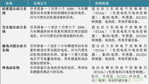 隨著世界范圍的人們對更高能源效率的交通方式的需求增加,HEV/EVs將首當其沖,成為人們的首要選擇的交通方式。為了更好的了解電動與混合動力車輛市場的潛力與發(fā)展情況,我們不可避免的要知道在本文中提到的是什么類型的車輛。在Strategy Analytics[1]的報告中:“2007年到2021年混合動力車輛系統(tǒng)的需求預測,”將HEV/EV分為四類: