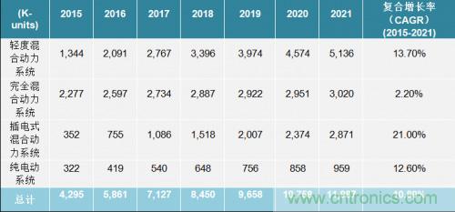 如表1所示,每部車輛都可能搭載1到4個電機。(搭載4個電機是出于每個輪胎都需要一臺電機)。每臺使用的電機都將需要搭配合適的系統(tǒng),以安全高效地驅(qū)動與控制這些電機。這些系統(tǒng)需要具備控制可見性和粒度,以實現(xiàn)合適的扭矩與電機控制。牢記電機與其控制系統(tǒng)需要的知識,表2(同樣來自Strategy Analytics的報告)給2015-2021期間市場上的每種類型車輛的數(shù)量一個估計值