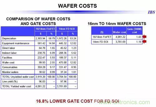晶體管成本,根據(jù)他的計(jì)算,14納米FD-SOI工藝單位晶體管成本比相應(yīng)的FinFET工藝低了近17%。