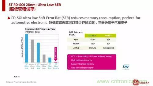 除了低功耗與低成本,F(xiàn)D-SOI工藝在可靠性上也表現(xiàn)出色。沈磊指出,從意法半導(dǎo)體給出的數(shù)據(jù)來看,由于FD-SOI工藝的敏感體積更小,對閂鎖效應(yīng)(latch-up)免疫,具備更低的SRAM軟錯誤率,以及更好的電磁兼容性,使其更適用于高可靠應(yīng)用領(lǐng)域,例如汽車、銀行與生命維持系統(tǒng)等。