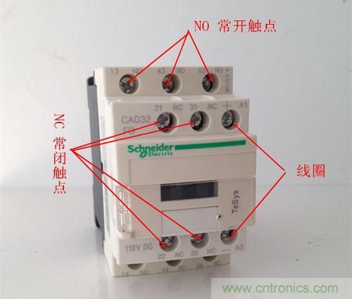 上圖是接觸器,繼電器與之相比較小,但原理相同。共有兩排共12個(gè)接線柱(2個(gè)接線柱,一進(jìn)一出算1組)。最上面一排接線柱中,有2組常閉觸點(diǎn),和1組