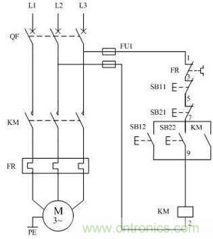 有了點(diǎn)動(dòng)和連動(dòng)的知識,這個(gè)圖中接觸器KM的作用就不必多說了。圖中SB11和SB21為停止按鈕,SB12和SB22為啟動(dòng)按鈕。其中把任意一個(gè)啟動(dòng)按鈕和停止按鈕安裝在同一個(gè)按鈕箱內(nèi),另外兩個(gè)也安裝在另外一個(gè)按鈕箱內(nèi)。兩個(gè)按鈕箱可分別放在控制室和電動(dòng)機(jī)旁。