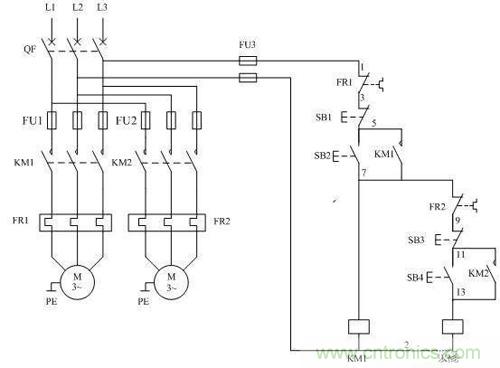 若需要其它電機(jī)在M1啟動(dòng)后才能啟動(dòng),則把該電機(jī)的控制回路與M2的控制回路并聯(lián)。