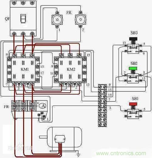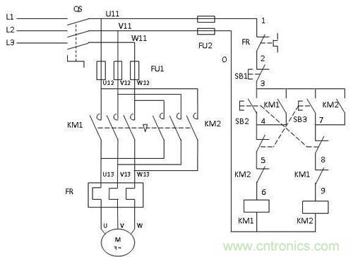 這張圖如果沒有編號6和編號9那兩個(gè)接觸器常閉觸點(diǎn),和編號5和編號8那兩個(gè)機(jī)械互鎖按鈕的常閉觸點(diǎn),就很好理解。即按下SB2,電動(dòng)機(jī)正轉(zhuǎn),按下SB3,電動(dòng)機(jī)反轉(zhuǎn)。