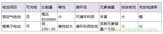 鋁空氣電池與現(xiàn)今的鋰離子電池相比的優(yōu)劣如下表所示。