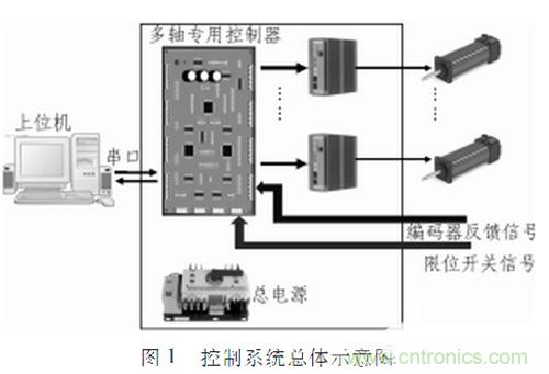 多軸控制器與上位機、電機驅動器等配合使用,圖1為采用多軸控制器組成的控制系統(tǒng)總體示意圖。控制器接收上位機發(fā)送的控制指令,分析處理并產(chǎn)生相應的方向信號、脈沖信號給驅動器,從而達到控制電機運行的目的。為了提高系統(tǒng)的控制精度,將電機的編碼器信號作為反饋信號輸入給控制器(內部實現(xiàn)自動辨向及四細分)。在各軸運動過程中,專用控制器對電機運行的絕對位移進行記錄,并且可以實時地將各軸的絕對位置信息上傳給上位機。另外在電機運行的過程中,為了保證電機運行的安全性,控制器還采用了限位信號反饋實現(xiàn)全硬件保護措施。