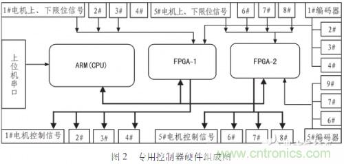 專用控制器由arm(LPC2214)、fpga(EP2C5T144C8)、驅動器接口電路、編碼器接口電路、限位檢測電路和電源電路等組成,如圖2為一個八軸電機控制器的硬件組成圖。arm通過串口實現(xiàn)與上位機之間的通信,解析從上位機獲得的控制指令,并通過fpga產(chǎn)生相應輸出信號給驅動器接口,驅動器接口外接驅動器。編碼器信號作為位置反饋信號同編碼器接口相連,形成位置環(huán)反饋。限位信號作為安全檢測信號同限位檢測接口相連,為整個系統(tǒng)添加一道安全保障。