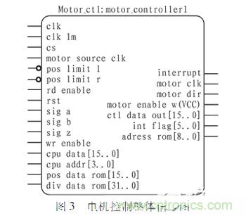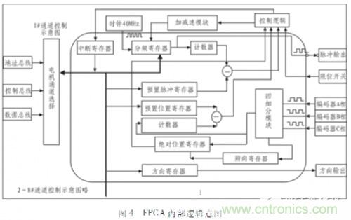 專用控制器在完成整個控制的過程中,arm只負責指令解析、控制指令發(fā)送、實時數(shù)據(jù)上傳等任務,fpga才是多軸專用控制器的核心。通過Verilog HDL語言在fpga內部實現(xiàn)了加減速曲線、編碼器信號辯向及四細分、絕對位移記錄等功能。圖3為電機控制的整體輸入、輸出信號圖,通過片選信號CS、讀有效信號rd_enable、寫有效圖信號wr_enable進行電機通道選擇。圖4給出了1#通道控制的fpga內部邏輯示意圖,下面將逐一對各主要模塊進行詳細介紹。
