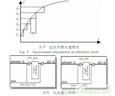 為了更有效、更理想地控制電機的運行,在fpga內部設計了加減速曲線模塊。文中采用了一種近似指數(shù)加減速曲線的方法,如圖5為近似指數(shù)加速曲線,減速曲線與之對稱。速度等距分布,那么在該速度級上保持的時間不一樣場。為了簡化,用速度級數(shù)N與一個常數(shù)C的乘積去模擬并且保持的時間用不熟來代替。因此,速度每升一級,電機都要在該速度級上走NC步(其中N為該速度級數(shù))。