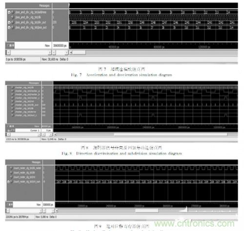在QuartusⅡ編譯環(huán)境下成功編譯之后,調用Modulesim仿真軟件,編寫仿真程序,使之產(chǎn)生全局時鐘、復位信號、相位差為90度的A、B相信號和Z相信號。如圖8所示,給出了該多軸控制器中所采用的編碼器信號辯相及四細分的功能仿真圖。