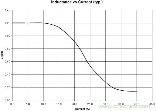 電感中直流電流的增加時(shí),電感透磁率的數(shù)值會(huì)逐漸減少,因此電感值會(huì)緩慢下降。電感廠(chǎng)商會(huì)根據(jù)電感的電感值的下降程度為指標(biāo)的額定電流,"基于電感值的變化率的額定電流",即Saturation Current,大部分電感廠(chǎng)商將電感值下降20%時(shí)的通過(guò)電感直流電流作為額定電流。下圖是Wurth公司某款電感的電感值vs電流的曲線(xiàn)圖。該款電感規(guī)格書(shū)上將saturation current設(shè)定為電感值下降10%時(shí)的電流值,為16.6A。如果將saturation current設(shè)定為電感值下降20%時(shí)的電流值的話(huà),大約為18.2A。