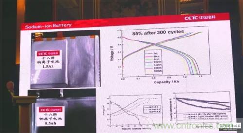 我們做了1.5Ah和0.5Ah兩種軟包全電池,正極材料采用前面提到的鎳錳氧化物,負(fù)極采用生物質(zhì)的硬碳材料,經(jīng)300次循環(huán)后容量衰降為15%。由此可見,鈉離子電池用廉價(jià)材料是可以制備的,而且電性能良好。